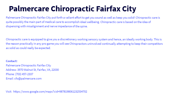 Palmercare Chiropractic Fairfax City put forth a valiant effort to get you sound as well as keep you solid! Chiropractic care is quite possibly the main part of medical care to accomplish ideal wellbeing. Chiropractic care is based on the idea of dispensing with misalignment and nerve impedance of the spine. Chiropractic care is equipped to give you a discretionary working sensory system and hence, an ideally working body. This is the reason practically in any pro game you will see Chiropractors uninvolved continually attempting to keep their competitors as solid as could really be expected. Contact: Palmercare Chiropractic Fairfax City Address: 3970 Walnut St, Fairfax, VA, 22030 Phone: (703) 457-2337 Email: cfo@palmercare.com Visit: https://www.google.com/maps?cid=9878198061232534702