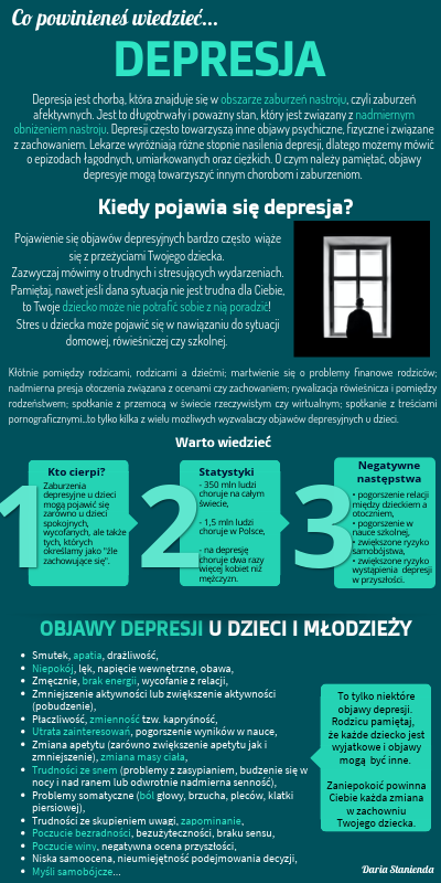 To tylko niektóre objawy depresji. Rodzicu pamiętaj, że każde dziecko jest wyjatkowe i objawy mogą być inne. Zaniepokoić powinna Ciebie każda zmiana w zachowniu Twojego dziecka.