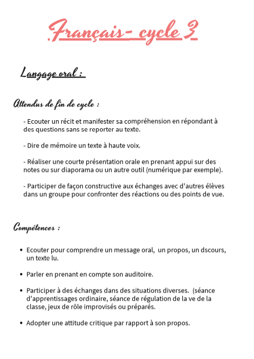 - Ecouter un récit et manifester sa compréhension en répondant à des questions sans se reporter au texte. - Dire de mémoire un texte à haute voix. - Réaliser une courte présentation orale en prenant appui sur des notes ou sur diaporama ou un autre outil (numérique par exemple). - Participer de façon constructive aux échanges avec d'autres élèves dans un groupe pour confronter des réactions ou des points de vue.