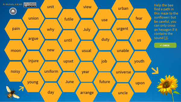 Help the bee find a path in this maze to the sunflower: but be careful, you can only cross an hexagon if it contains the sound [j].