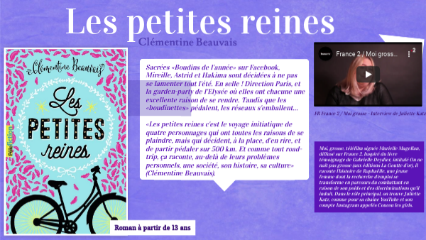 Sacrées «Boudins de l'année» sur Facebook, Mireille, Astrid et Hakima sont décidées à ne pas se lamenter tout l'été. En selle ! Direction Paris, et la garden-party de l'Elysée où elles ont chacune une excellente raison de se rendre. Tandis que les «boudinettes» pédalent, les réseaux s'emballent... «Les petites reines c'est le voyage initiatique de quatre personnages qui ont toutes les raisons de se plaindre, mais qui décident, à la place, d'en rire, et de partir pédaler sur 500 km. Et comme tout road-trip, ça raconte, au-delà de leurs problèmes personnels, une société, son histoire, sa culture» (Clémentine Beauvais).