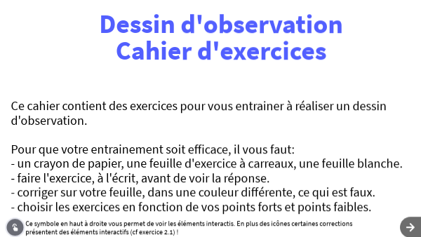 Ce cahier contient des exercices pour vous entrainer à réaliser un dessin d'observation. Pour que votre entrainement soit efficace, il vous faut: - un crayon de papier, une feuille d'exercice à carreaux, une feuille blanche. - faire l'exercice, à l'écrit, avant de voir la réponse. - corriger sur votre feuille, dans une couleur différente, ce qui est faux. - choisir les exercices en fonction de vos points forts et points faibles.