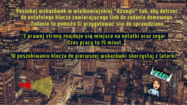 Poszukaj wskazówek w wielkomiejskiej "dżungli" tak, aby dotrzeć do ostatniego klucza zawierającego link do zadania domowego. Zadanie to pomoże Ci przygotować się do sprawdzianu.