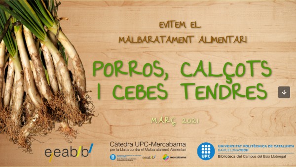 Arran de creació de la Càtedra UPC-Mercabarna pel malbaratament alimentari, la Biblioteca del Campus del Baix Llobregat col·labora mensualment en la sensibilització d'aquest tema a través de la difusió d'informació sobre un aliment de temporada. Per evitar el malbaratament i gaudir la cuina d’aprofitament, t’oferim nous consells i receptes de la Montse Vallory, xef graduada al Natural Gourmet Institute, Nova York. Finalment hi trobaràs la informació disponible a la UPC sobre malbaratament alimentari (producció científica i acadèmica).