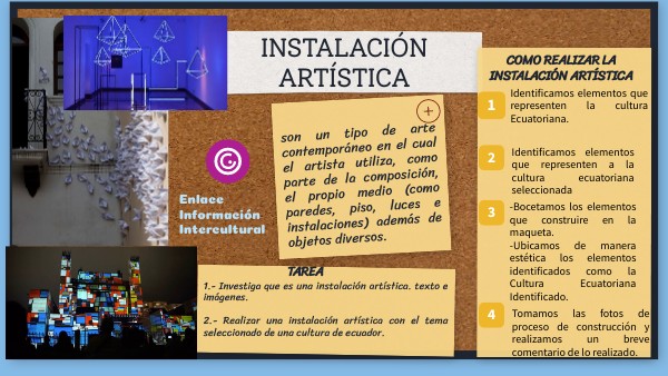 1.- Investiga que es una instalación artística. texto e imágenes. 2.- Realizar una instalación artística con el tema seleccionado de una cultura de ecuador.