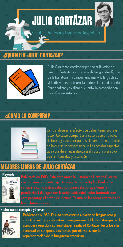 Julio Coratázar, escritor argentino cultivador de cuentos fantásticos como una de las grandes figuras de la literatura hispanoamericana. A lo largo de su vida dio varias conferencias sobre el oficio de escribir. Para analizar y explicar al cuento, lo comparto con otras formas Artísticas.