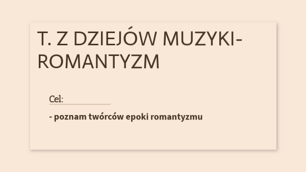 - poznam twórców epoki romantyzmu KS: - wiem, kiedy trwała epoka romantyzmu - znam przedstawicieli muzyki romantycznej - znam instrumenty wykorzystywane w romantyźmie - znam twórczość kompozytorów z tej epoki