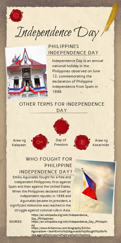 Independence Day is an annual national holiday in the Philippines observed on June 12, commemorating the declaration of Philippine independence from Spain in 1898.