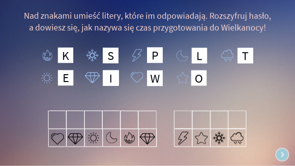 Nad znakami umieść litery, które im odpowiadają. Rozszyfruj hasło, a dowiesz się, jak nazywa się czas przygotowania do Wielkanocy!