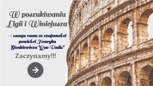 Czy polubiłeś Ligię i Winicjusza?Jeśli tak, koniecznie musisz im pomóc. Zły Neron uwięził ich w komnacie tortur chrześcijan. Twoim zadaniem jest odnalezienie tej komnaty i wydostanie z niej naszych bohaterów. Możesz to zrobić tylko w jeden sposób. Rozwiąż cztery zagadki związane z powieścią Henryka Sienkiewicza "Quo vadis" i odkryj czterocyfrowy kod pozwalający na otwarcie drzwi komnaty tortur chrześcijan i ocalenie Ligii i Winicjusza. W mrokach tajemniczych komnat Nerona pomogą Ci: dobra znajomość lektury, bibliotekarka Róża, kartka papieru i ołowek.