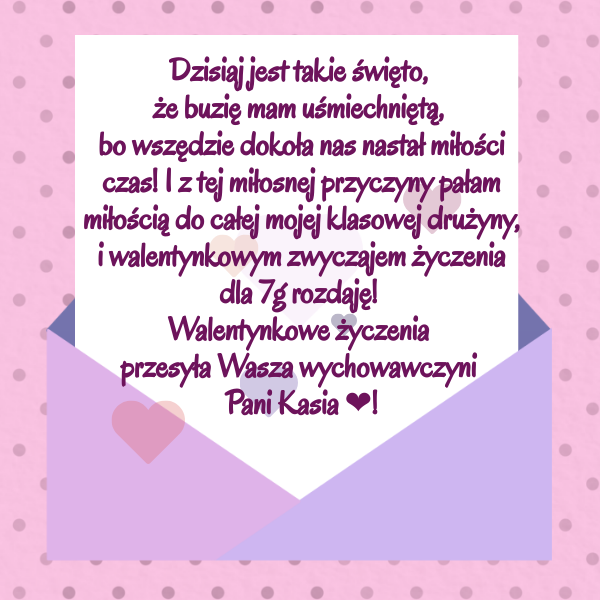 Dzisiaj jest takie święto, że buzię mam uśmiechniętą, bo wszędzie dokoła nas nastał miłości czas! I z tej miłosnej przyczyny pałam miłością do całej mojej klasowej drużyny, i walentynkowym zwyczajem życzenia dla 7g rozdaję! Walentynkowe życzenia przesyła Wasza wychowawczyni Pani Kasia ❤️!