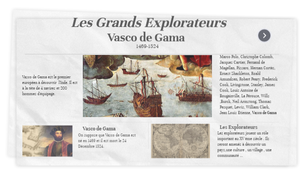 Marco Polo, Christophe Colomb, Jacques Cartier, Fernand de Magellan, Pissaro, Hernan Cortès, Ernest Shackleton, Roald Amundsen, Robert Peary, Frederick Cook, Livingstone, Stanley, James Cook, Louis Antoine de Bougainville, La Pérouse, Wills ,Burck, Neil Armstong, Thomas Pesquet, Lewis, William Clark, Jean Louis Etienne, Vasco de Gama
