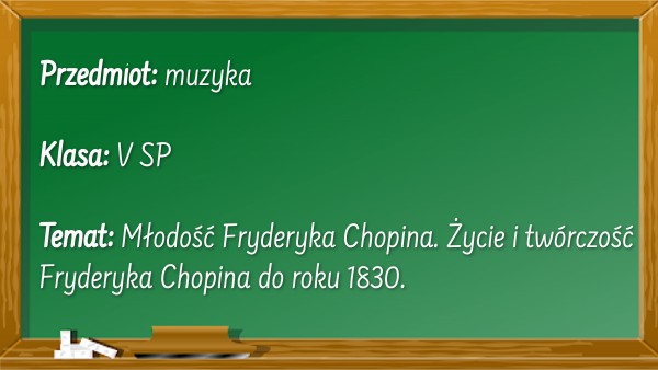 Przedmiot: muzyka Klasa: V SP Temat: Młodość Fryderyka Chopina. Życie i twórczość Fryderyka Chopina do roku 1830.