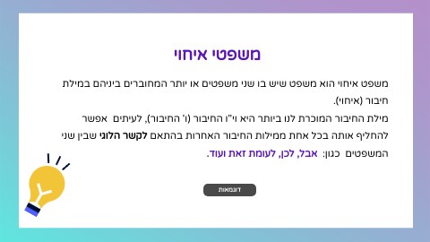 1. השעון המעורר לא פעל הבוקר. 2. יצאתי מהבית במהירות ללא כרטיס הרב קו. כשנחבר את שני המשפטים למשפט איחוי, המשפט שיתקבל הוא: השעון המעורר לא פעל הבוקר, ולכן יצאתי מהבית במהירות.