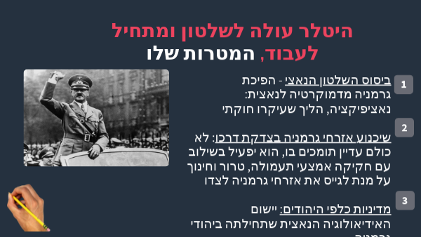 ביסוס השלטון הנאצי - הפיכת גרמניה מדמוקרטיה לנאצית: נאציפיקציה, הליך שעיקרו חוקתי שיכנוע אזרחי גרמניה בצדקת דרכו: לא כולם עדיין תומכים בו, הוא יפעיל בשילוב עם חקיקה אמצעי תעמולה, טרור וחינוך על מנת לגייס את אזרחי גרמניה לצדו מדיניות כלפי היהודים: יישום האידיאולוגיה הנאצית שתחילתה ביהודי גרמניה