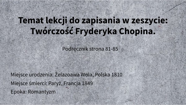 Temat lekcji do zapisania w zeszycie: Twórczość Fryderyka Chopina.