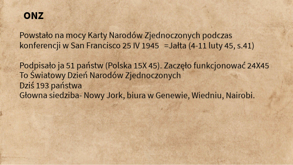Powstało na mocy Karty Narodów Zjednoczonych podczas konferencji w San Francisco 25 IV 1945 =Jałta (4-11 luty 45, s.41) Podpisało ja 51 państw (Polska 15X 45). Zaczęło funkcjonować 24X45 To Światowy Dzień Narodów Zjednoczonych Dziś 193 państwa Głowna siedziba- Nowy Jork, biura w Genewie, Wiedniu, Nairobi.