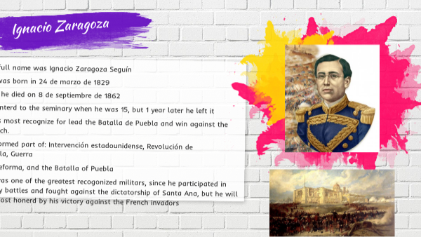 His full name was Ignacio Zaragoza Seguín He was born in 24 de marzo de 1829 And he died on 8 de septiembre de 1862 He enterd to the seminary when he was 15, but 1 year later he left it He is most recognize for lead the Batalla de Puebla and win against the French. He formed part of: Intervención estadounidense, Revolución de Ayutla, Guerra de Reforma, and the Batalla of Puebla He was one of the greatest recogonized militars, since he participated in many battles and fought against the dictatorship of Santa Ana, but he will be most honerd by his victory against the French invadors