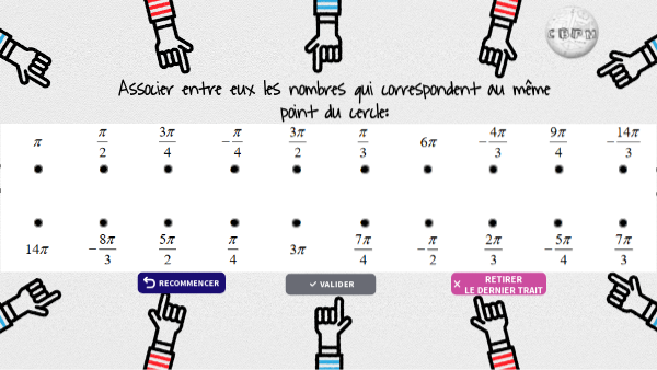 Associer entre eux les nombres qui correspondent au même point du cercle: