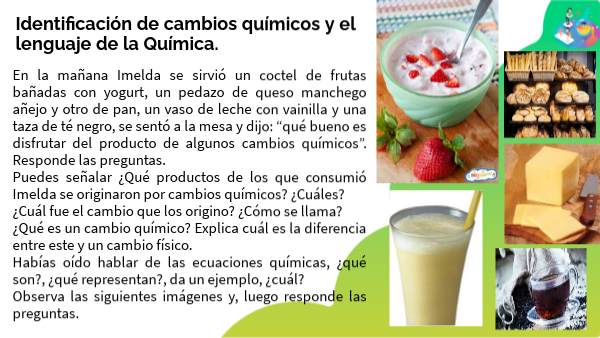 En la mañana Imelda se sirvió un coctel de frutas bañadas con yogurt, un pedazo de queso manchego añejo y otro de pan, un vaso de leche con vainilla y una taza de té negro, se sentó a la mesa y dijo: “qué bueno es disfrutar del producto de algunos cambios químicos”. Responde las preguntas. Puedes señalar ¿Qué productos de los que consumió Imelda se originaron por cambios químicos? ¿Cuáles? ¿Cuál fue el cambio que los origino? ¿Cómo se llama? ¿Qué es un cambio químico? Explica cuál es la diferencia entre este y un cambio físico. Habías oído hablar de las ecuaciones químicas, ¿qué son?, ¿qué representan?, da un ejemplo, ¿cuál? Observa las siguientes imágenes y, luego responde las preguntas.
