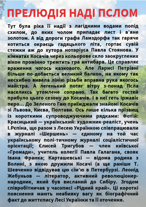 Тут була ріка її надії з лагідними водами попід схилом, до яких чолом припадає лист і в’яне золотом. А від дороги графа Ламздорфа так гаряче котиться окраєць гадяцького літа, гортає сувій стежки аж до хутора нотаріуса Павла Стоянова. У кімнатах Косачів через кольорове скло заокруглених вікон промінно тремтить гра антибарв. Це справляє враження чогось казкового. Але Ларисі Петрівні більше по-добається великий балкон, на якому так несхибно вивела лінію різьби вправна рука якогось майстра. А легенький потяг вітру з-понад Псла населиєсь утомлене сопрано. Так багато гостей прибуло цього сезону до Косачів. І в неї геть іржавіє перо... До Зеленого Гаю приїжджали знайомі Косачів зі Львова, Києва, Полтави. Ось лише кілька прізвищ із короткими супроводжуючими рядками: Фотій: Красицький — український: художник-реаліст, учень І.Рєпіна, що разом з Лесею Українкою співпрацювали в журналі «Шершень» — єдиному на той час українському полі-тичному журналі соціалістичної орієнтації; Єлисей Тригубов — член київської «Громади», учитель колегії Павла Галагана, свояк Івана Франка; Карташевські — відома родина з Волині, з якою дружили Косачі (а ще раніше Т. Шевченко відвідував цю сім’ю в Петербурзі. Леонід Жебуньов — літератор, активний революціонер- народник, який був висланий до Сибіру. Згодом співробітничав у часописі «Рідний край». Ці короткі пояснення мають неабияку вагу як біографічний факт до життєпису Лесі Українки та її оточення.
