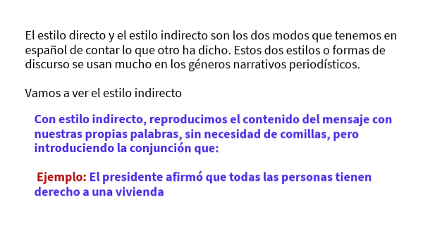 Con estilo indirecto, reproducimos el contenido del mensaje con nuestras propias palabras, sin necesidad de comillas, pero introduciendo la conjunción que: Ejemplo: El presidente afirmó que todas las personas tienen derecho a una vivienda