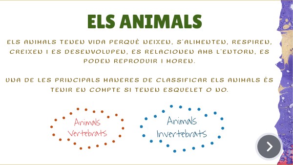 Els animals tenen vida perquè neixen, s’alimenten, respiren, creixen i es desenvolupen, es relacionen amb l’entorn, es poden reproduir i moren. Una de les principals maneres de classificar els animals és tenir en compte si tenen esquelet o no.