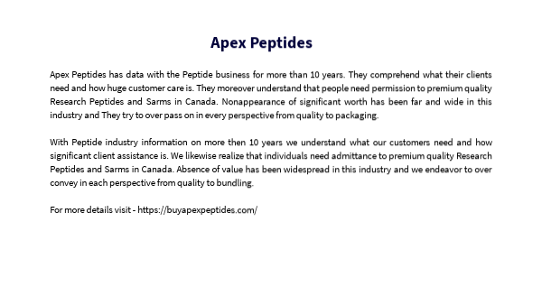 Apex Peptides has data with the Peptide business for more than 10 years. They comprehend what their clients need and how huge customer care is. They moreover understand that people need permission to premium quality Research Peptides and Sarms in Canada. Nonappearance of significant worth has been far and wide in this industry and They try to over pass on in every perspective from quality to packaging. With Peptide industry information on more then 10 years we understand what our customers need and how significant client assistance is. We likewise realize that individuals need admittance to premium quality Research Peptides and Sarms in Canada. Absence of value has been widespread in this industry and we endeavor to over convey in each perspective from quality to bundling. For more details visit - https://buyapexpeptides.com/