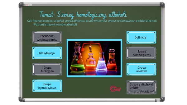 Cel: Poznanie pojęć: alkohol, grupa alkilowa, grupa funkcyjna, grupa hydroksylowa, podział alkoholi. Poznanie nazw i wzorów alkoholi.