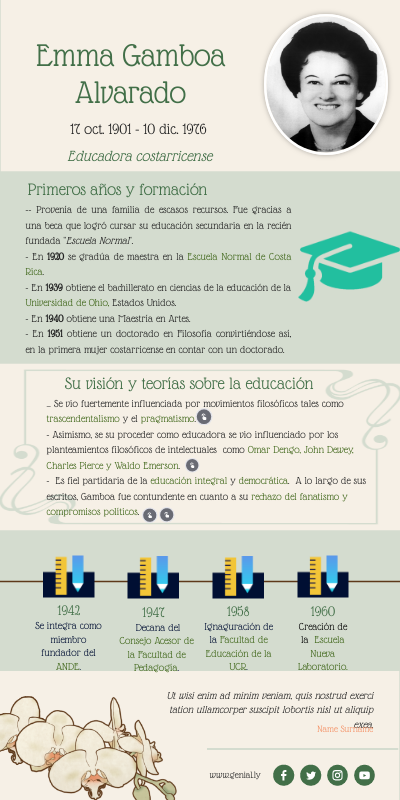 -- Provenía de una familia de escasos recursos. Fue gracias a una beca que logró cursar su educación secundaria en la recién fundada "Escuela Normal".- En 1920 se gradúa de maestra en la Escuela Normal de Costa Rica. - En 1939 obtiene el bachillerato en ciencias de la educación de la Universidad de Ohio, Estados Unidos. - En 1940 obtiene una Maestría en Artes. - En 1951 obtiene un doctorado en Filosofía convirtiéndose así, en la primera mujer costarricense en contar con un doctorado.