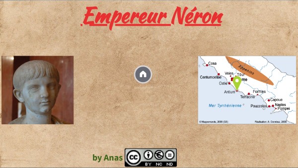 Informations : https://fr.wikipedia.org/wiki/N%C3%A9ron#cite_note-2 https://www.linternaute.fr/actualite/biographie/1776112-neron-biographie-courte-dates-citations/ https://www.lefigaro.fr/histoire/2018/12/05/26001-20181205ARTFIG00213-neron-fut-il-un-artiste-ou-un-histrion.php https://www.lefigaro.fr/histoire/2018/12/04/26001-20181204ARTFIG00235-neron-a-t-il-renforce-ou-sape-la-puissance-romaine.php https://www.futura-sciences.com/sciences/dossiers/histoire-neron-plus-celebres-empereurs-romains-1313/page/2/ https://www.vanityfair.fr/savoir-vivre/story/secrets-dhistoire-le-jour-ou-lempereur-neron-emascula-un-esclave-pour-lepouser/13117 images : https://www.romanoimpero.com/2010/07/domus-tiberiana.html https://www.rome-museum.com/domus-aurea.phphttps://commons.wikimedia.org/wikiFile:Gnaeus_Domitius_Ahenobarbus_(Konsul_32).jpg https://mappemonde-archive.mgm.fr/num19/articles/art08304.html https://www.flickr.com/photos/lespetitescases/17109473402 https://gw.geneanet.org/zardoz?lang=fr&n=julio+claudiens&oc=0&p=julia+agrippina https://fr.wikipedia.org/wiki/Claude_(empereur_romain) https://julioclaudiens.wordpress.com/2015/03/10/neron/cropped-ner_27_672-458_resize-r0kjdm2-jpg/ in https://zims-fr.kiwix.campusafrica.gos.orange.com/vikidia_fr_all_maxi/A/Empereur_romain.htm