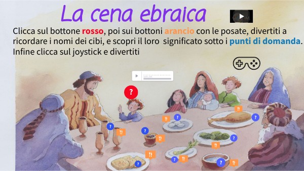Clicca sul bottone rosso, poi sui bottoni arancio con le posate, divertiti a ricordare i nomi dei cibi, e scopri il loro significato sotto i punti di domanda. Infine clicca sul joystick e divertiti