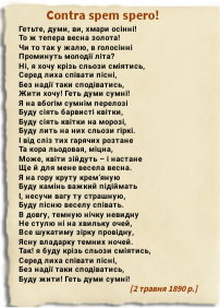 Гетьте, думи, ви, хмари осінні! То ж тепера весна золота! Чи то так у жалю, в голосінні Проминуть молодії літа? Ні, я хочу крізь сльози сміятись, Серед лиха співати пісні, Без надії таки сподіватись, Жити хочу! Геть думи сумні! Я на вбогім сумнім перелозі Буду сіять барвисті квітки, Буду сіять квітки на морозі, Буду лить на них сльози гіркі. І від сліз тих гарячих розтане Та кора льодовая, міцна, Може, квіти зійдуть – і настане Ще й для мене весела весна. Я на гору круту крем’яную Буду камінь важкий підіймать І, несучи вагу ту страшную, Буду пісню веселу співать. В довгу, темную нічку невидну Не стулю ні на хвильку очей, Все шукатиму зірку провідну, Ясну владарку темних ночей. Так! я буду крізь сльози сміятись, Серед лиха співати пісні, Без надії таки сподіватись, Буду жити! Геть думи сумні!