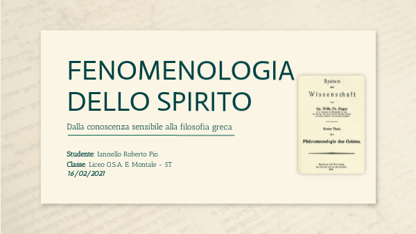 La fenomenologia dello spirito è un testo scritto da Hegel che studia la storia del processo attraverso il quale si evolve la conoscenza. Questo processo avviene seguendo varie tappe che corrispondono, in maniera non precisa, a determinati periodi storici. In questo caso andremo ad analizzare le prime tappe percorse dalla coscienza, partendo quindi dalla conoscenza sensibile per poi fermarci alla filosofia greca del periodo ellenistico.