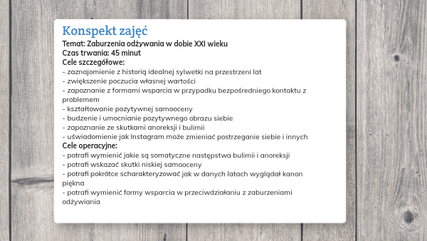 Cele szczegółowe: - zaznajomienie z historią idealnej sylwetki na przestrzeni lat - zwiększenie poczucia własnej wartości - zapoznanie z formami wsparcia w przypadku bezpośredniego kontaktu z problemem - kształtowanie pozytywnej samooceny - budzenie i umocnianie pozytywnego obrazu siebie - zapoznanie ze skutkami anoreksji i bulimii - uświadomienie jak Instagram może zmieniać postrzeganie siebie i innych Cele operacyjne: - potrafi wymienić jakie są somatyczne następstwa bulimii i anoreksji - potrafi wskazać skutki niskiej samooceny - potrafi pokrótce scharakteryzować jak w danych latach wyglądał kanon piękna - potrafi wymienić formy wsparcia w przeciwdziałaniu z zaburzeniami odżywiania