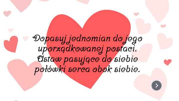 Dopasuj jednomian do jego uporządkowanej postaci. Ustaw pasujące do siebie połówki serca obok siebie.