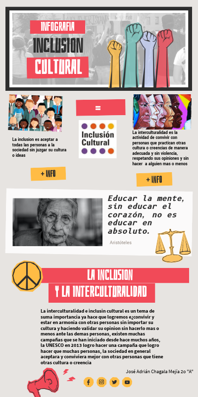 La interculturalidad e inclusin cultural es un tema de suma importancia ya hace que logremos e¿convivir y estar en armonia con otras personas sin importar su cultura y haciendo validar su opinion sin hacerlo mas o menos ante las demas personas, existen muchas campañas que se han iniciado desde hace muchos años, la UNESCO en 2013 logro hacer una campaña que logro hacer que muchas personas, la sociedad en general aceptara y conviviera mejor con otras personas que tiene otras cultura o creencia