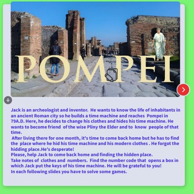 Jack is an archeologist and inventor. He wants to know the life of inhabitants in an ancient Roman city so he builds a time machine and reaches Pompei in 79A.D. Here, he decides to change his clothes and hides his time machine. He wants to become friend of the wise Pliny the Elder and to know people of that time. After living there for one month, it's time to come back home but he has to find the place where he hid his time machine and his modern clothes . He forgot the hidding place.He's desperate! Please, help Jack to come back home and finding the hidden place. Take notes of clothes and numbers. Find the number code that opens a box in which Jack put the keys of his time machine. He will be grateful to you! In each following slides you have to solve some games.