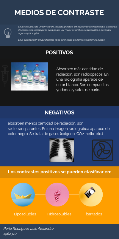 En los estudios de un servicio de radiodiagnóstico, en ocasiones es necesaria la utilización de contrastes radiológicos para poder ver mejor estructuras adyacentes o descartar algunas patologías.En la clasificación de los distintos tipos de medios de contraste tenemos 2 tipos: