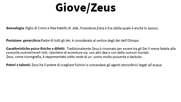 Genealogia :figlio di Crono e Rea fratello di ,Ade, Poseidone,Estia e Era (della quale è anche lo sposo). Posizione gerarchica:Padre di tutti gli dei, è considerato al vertice degli dei dell'Olimpo. Caratteristiche psico-fisiche e difetti: Tradizionalemte Zeus è rinomato per essere tra gli Dei il meno fedele alla consorte,numnerrevoli miti, riportano di avventure sia con altri dee e con delle comuni mortali. Zeus, come iconografia, è rappresentato sotto veste di un uomo molto possente e barbuto. Poteri e talenti: Zeus ha il potere di scagliare fulmini e comandare gli agenti atmosferici legati all'acqua