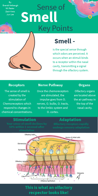 is the special sense through which odors are perceived. It occurs when an stimuli binds to a receptor within the nasal cavity, transmitting a signal through the olfactory system.