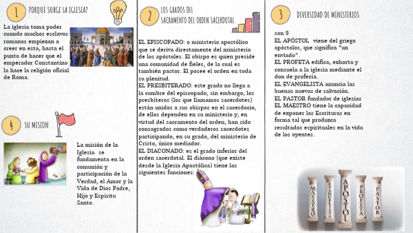 EL EPISCOPADO: o ministerio apostólico que se deriva directamente del ministerio de los apóstoles. El obispo es quien preside una comunidad de fieles, de la cual es también pastor. El posee el orden en toda su plenitud.EL PRESBITERADO: este grado no llega a la cumbre del episcopado, sin embargo, los presbíteros (los que llamamos sacerdotes) están unidos a sus obispos en el sacerdocio, de ellos dependen en su ministerio y, en virtud del sacramento del orden, han sido consagrados como verdaderos sacerdotes participando, en su grado, del ministerio de Cristo, único mediador. EL DIACONADO: es el grado inferior del orden sacerdotal. El diácono (que existe desde la Iglesia Apostólica) tiene las siguientes funciones: