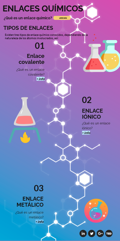 Existen tres tipos de enlace químico conocidos, dependiendo de la naturaleza de los átomos involucrados, así: