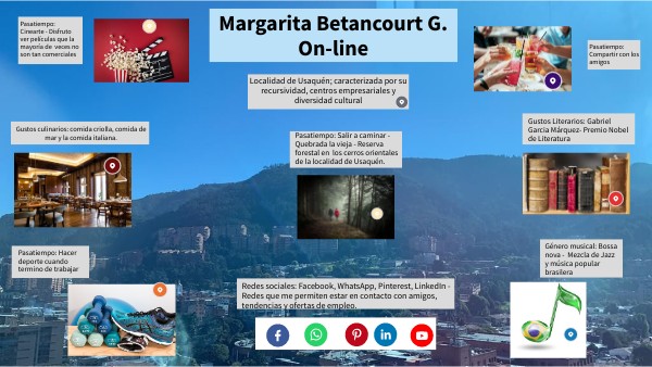 Redes sociales: Facebook, WhatsApp, Pinterest, LinkedIn - Redes que me permiten estar en contacto con amigos, tendencias y ofertas de empleo.