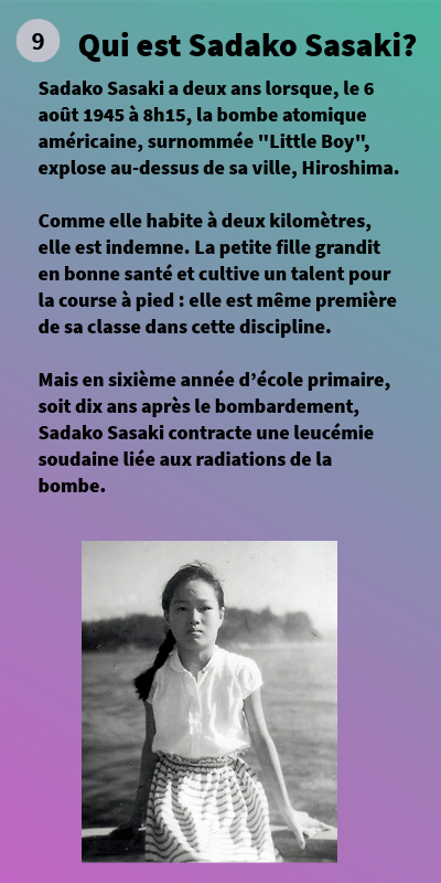 Sadako Sasaki a deux ans lorsque, le 6 août 1945 à 8h15, la bombe atomique américaine, surnommée "Little Boy", explose au-dessus de sa ville, Hiroshima. Comme elle habite à deux kilomètres, elle est indemne. La petite fille grandit en bonne santé et cultive un talent pour la course à pied : elle est même première de sa classe dans cette discipline. Mais en sixième année d’école primaire, soit dix ans après le bombardement, Sadako Sasaki contracte une leucémie soudaine liée aux radiations de la bombe.