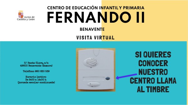 El CEIP fernando Ii es un centro de titularidad pÚblica ubicado en el barrio santa clara de benavente imparte enseñanzas de educación infantil y primaria, con sección bilingüe en inglés, ofreciendo servicios de integración y compensación educativa
