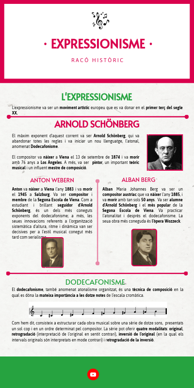 El màxim exponent d'aquest corrent va ser Arnold Schönberg, qui va abandonar totes les regles i va iniciar un nou llenguatge, l'atonal, anomenat Dodecafonisme. El compositor va nàixer a Viena el 13 de setembre de 1874 i va morir amb 76 anys a Los Ángeles. A més, va ser pintor, un important teòric musical i un influent mestre de composició.