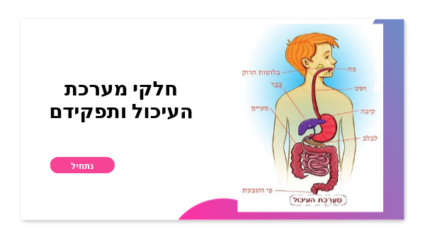 בשיעורים שערו למדנו על מערכת העיכול של בני האדם, על חלקים שלה, סוגים שונים של פירוקים ואיכן הם מתבצעים ועכשיו נעשה משחק קטן. אם שחחתם חלק ממה שלמדנו, אתם יכולים לעיזר בחזרה הקצרה שיש בדף "חזרה". לאחר מכך, אליכם לענות על השאילות מסוגים שונים בלשוניות שונות שיש בדף בית. בסוף של כל חלק תקבלו מספר. תשמרו את מספר הזה. כדי לסיים, אליכם , לאסוף ארבע מספרים, אחד מכל חלק של השאילות, ולהקליד אותם בכניסה לדף הסיום. בהצלחה!
