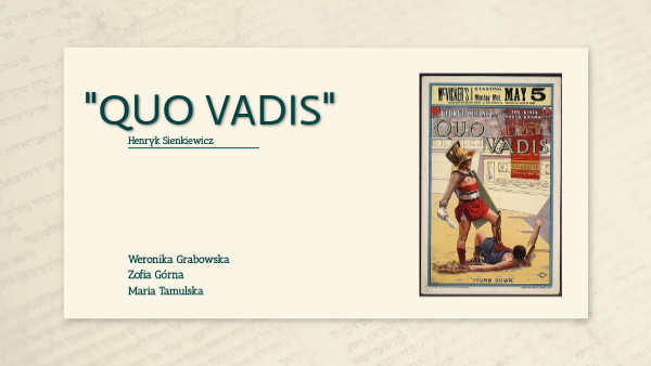 Quo Vadis to powieść historyczna, której akcja rozgrywa się w Rzymie za czasów panowania cesarza Nerona w I w. n.e. Głównym wątkiem utworu jest historia miłości pomiędzy pochodzącym z rzymskiej arystrokracji Markiem Winicjuszem a królewską córką plemienia Ligów- Ligią Kalliną. Ważnym zadaniem powieści jest ukazaniu kontrastu między wczesnymi chrześcijanami a zdegenerowanymi mieszkańcami Rzymu.