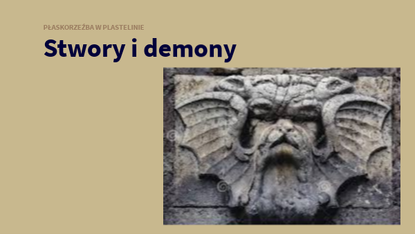 Tematem pracy będzie wykonanie w plastelinie płaskorzeźby (reliefu) pt. "Potwory i demony". W placku plasteliny o grubości ok. 1 cm grubości należy wykonać fantastycznego potwora lub zwierzę (może być głowa). Można doklejać rozmaite bryły: kule, walece, formy obłe itp. Można uzyskiwać różne faktury (powierzchnie). Praca może być inspirowana średniowecznymi maszkaronami, rzygaczami (gargulcami).